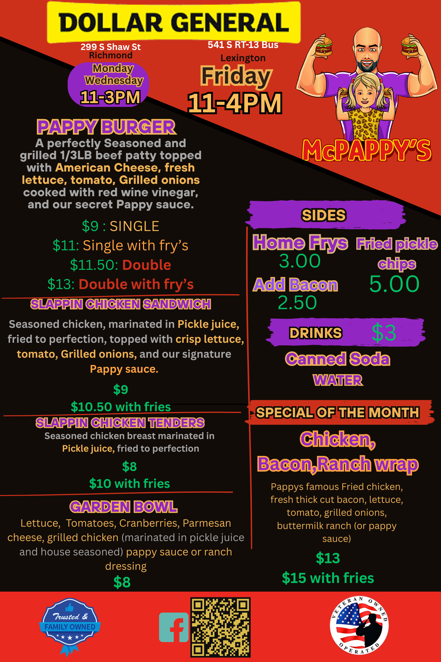 Freshly seasoned patty cooked to perfection. Topped with lettuce, tomato, onions, and our special "Pappy Sauce"